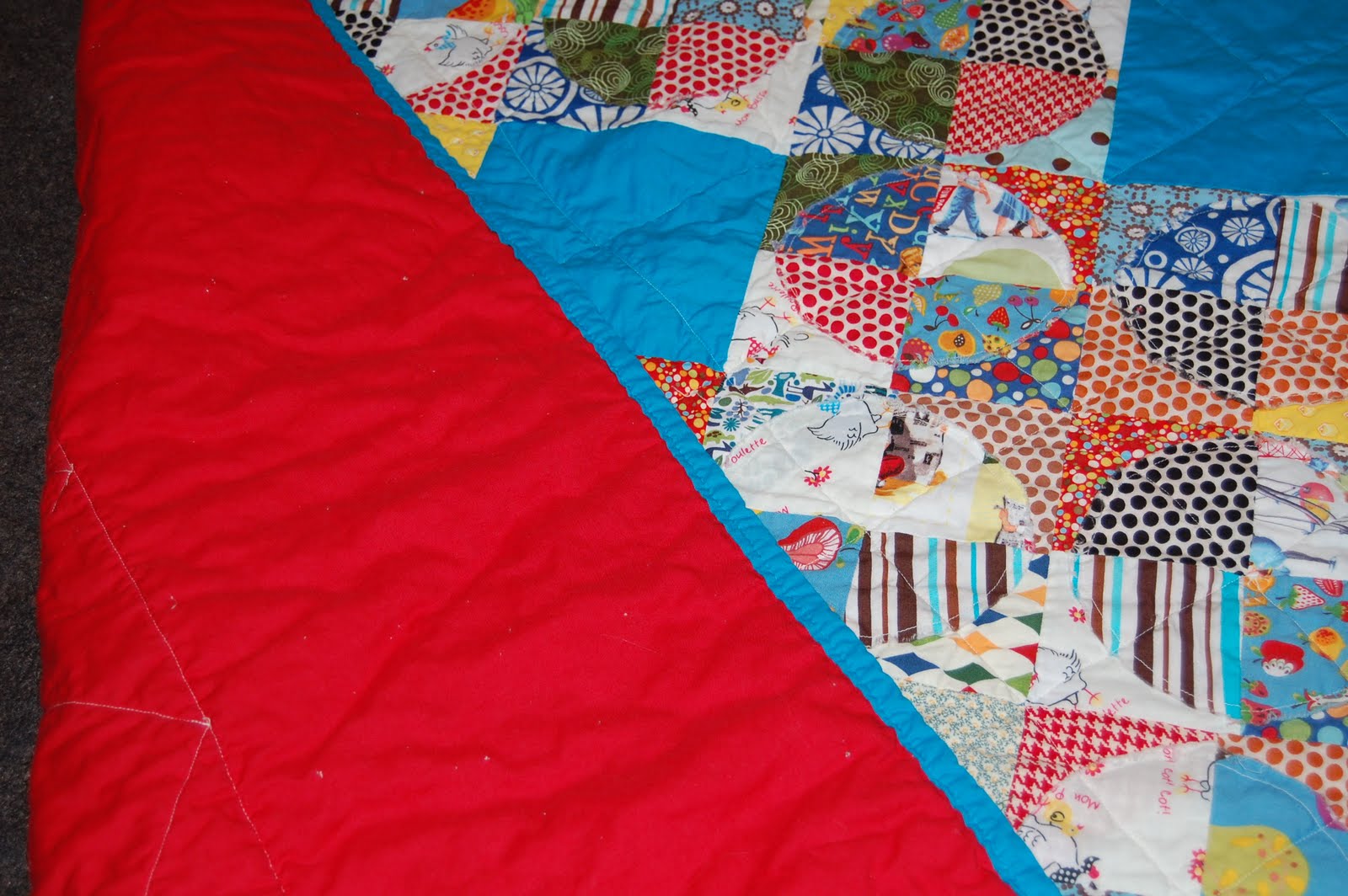 The next step was to top quilt the bugger...I wanted to do a cool meandering kind of thing but alas, I lack the machine and the talent; I also lack the money to pay someone with those two magical ingredients, so I opted instead for a basic X through each square kind of thing, which works okay. I am not good at straight lines, but I did discover just in the nick of time that I own a walking foot, so no bunching fabric for me! Hurrah. I also found a 1/4" seam foot, which would have come in handy oh, about five months ago. Next time.
